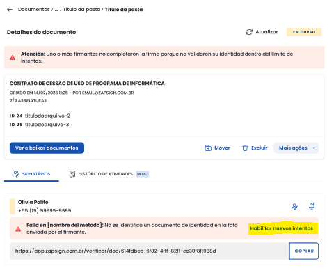2. Localize o signatário que atingiu o limite de tentativas e toque em “habilitar novas tentativas”.